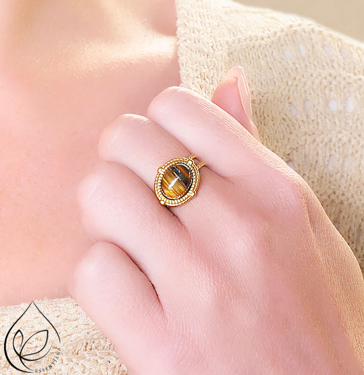 Pierre : Ornée d'une pierre véritable en Œil de Tigre naturel, sélectionnée pour ses bandes ambrées et son éclat soyeux.