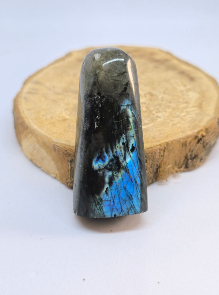 La Labradorite est une pierre fascinante, célèbre pour son jeu de couleurs métalliques — bleu, doré ou vert — appelé labradorescence. Taillée en forme libre, elle respecte la structure naturelle du cristal, offrant une surface polie qui laisse éclater ses feux intérieurs selon l'angle de vue. C'est la pierre des thérapeutes, des empathes et de tous ceux qui cherchent à protéger leur énergie.
