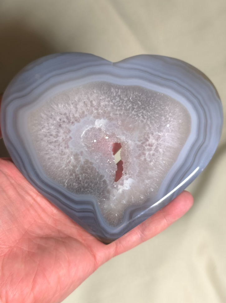 Les rubans que vous voyez sur les bords du cœur se sont formés couche après couche, par dépôts successifs de silice, pendant des millions d'années. Le centre vide est l'endroit où la solution minérale s'est retirée, laissant la place aux cristaux de se développer librement. C'est une véritable fenêtre sur le temps géologique.