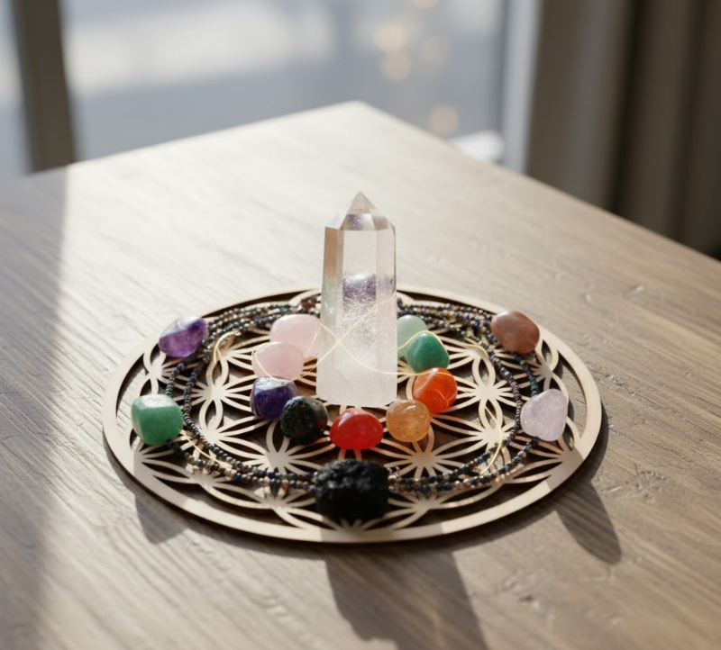 Rituel complet : Allumez un bâton d'encens (Sauge ou Palo Santo) à côté de votre plateau pour combiner la purification par la fumée et le rechargement par la géométrie sacrée.