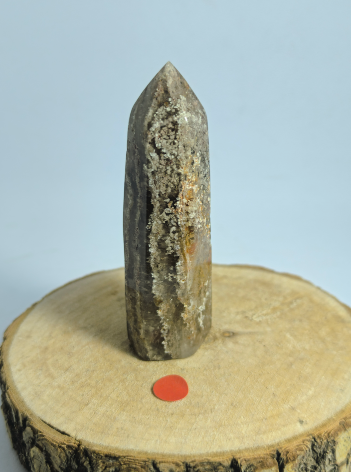 Le Quartz "Lutun" : La pointe avec le point rouge, montrant des inclusions neigeuses ou mousseuses, est souvent appelée "Quartz Shaman" car elle est utilisée pour faciliter les visions.