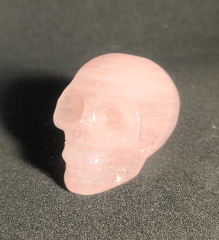 Le crâne sculpté agit comme un pont entre les mondes. Il est utilisé pour accéder à des plans de conscience supérieurs et pour favoriser l'introspection. Dans le cas du Quartz Rose, cette forme permet de conscientiser ses émotions et de porter un regard de sagesse sur son passé affectif, facilitant ainsi une compréhension profonde de son propre cœur.