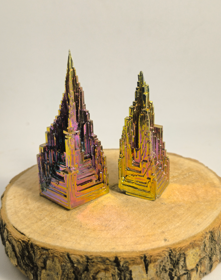 Le Bismuth est un métal rare qui, en cristallisant, forme des structures géométriques complexes appelées "trémies". Ses escaliers cubiques et ses spirales parfaites évoquent des cités futuristes ou des mandalas métalliques. C'est une pierre de transformation et de passage, symbolisant l'ordre émergeant du chaos et la progression structurée de l'esprit.