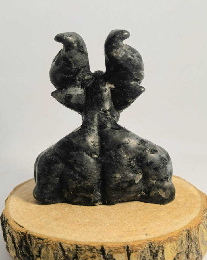 La stéatite, également connue sous le nom de « Pierre de Savon », est une roche métamorphique utilisée depuis des millénaires pour la sculpture sacrée. Sculptée sous la forme d'une créature cornue, elle incarne la force brute de la nature et le rôle de gardien des seuils. Ce buste aux nuances marbrées de gris et de noir nous rappelle que pour trouver l'équilibre, il faut savoir regarder ses propres zones d'ombre avec sérénité.