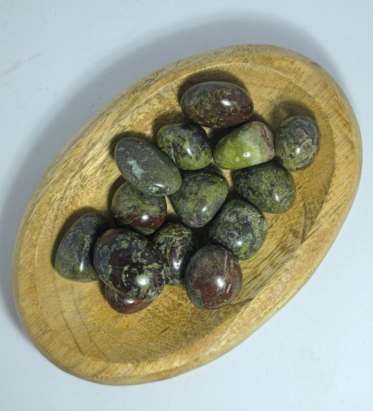 Le Jaspe Sang de Dragon (parfois appelé Épidote à inclusions de Piémontite) est une pierre spectaculaire dont les motifs évoquent une peau de reptile mythique. Sous sa forme roulée, il se présente comme un galet vert forêt profond (l'épidote) parsemé de taches ou de veines rouge sang (la piémontite). C’est la pierre de la vitalité, du courage personnel et de la régénération profonde.